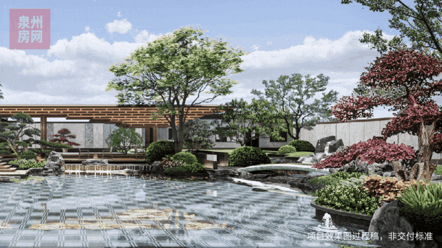 在园林打造上,项目匠造 三进院落,层层递进,尊崇归家礼遇; 廊、桥、亭、榭巧妙串联,营造极具江南气韵的诗意东方度假式园景, 精致四水归堂、沐光水院等空间可观、可游,让每次归家都是穿越风景的旅行。