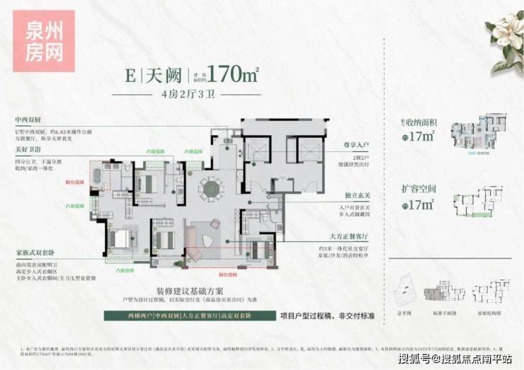 该户型为两梯两户布局,居住更纯粹;入户带 独立玄关、步入式储藏间,同频墅级入户仪式感; U型中西双厨,约6.85米操作台面,互联餐厅,纵享无界食光; 复合大方正厅,无论商务社交、亲朋聚会都尽显排面; 家族式双套卧配置,且分隔较远,互不干扰;豪华 主卧奢配超大双区步入式衣帽间,双台盆+浴缸星级卫浴5件套,以及L型宽景窗,生活直接升舱“顶配模式”,让一步改善有了最优选。