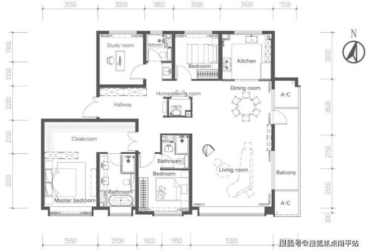 因此,这套四室三卫的户型,也可称作“2.5套房式设计”。