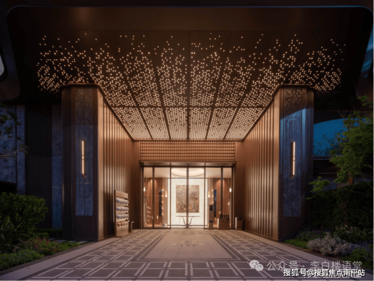 大门长约70m,高12m的恢弘尺度,采用高奢同款定制景德镇陶瓷釉面艺术砖打造进门影壁,单一面影壁的造价约达20万;融合凡尔赛宫轴线美学与岳麓书院人文符号的美学园林,地下光厅以星空穹顶、绿野仙踪大理石打造艺术归家动线;地上地下双入户大堂, 人脸识别+电动移门+智能呼梯,尊享无触感归家礼遇。业主归家的每一步都如度假般高级惬意;
