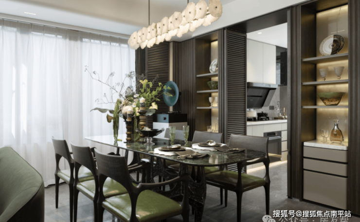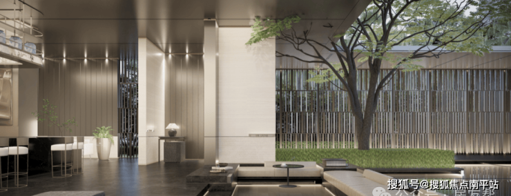 福州【华润·海湾润城】的社区规划藏着设计师的巧思:首层局部米白色仿石砖,外墙大面浅灰色和深灰色涂料,仿佛孩童随手勾勒的简笔画。约140平米的方舟酒廊以下沉式卡座设计,营造围炉夜话的温馨氛围。穿过风雨连廊后的森光水院,将自然元素引入室内,臻选蓝钻仿石砖切割自然起伏的涟漪纹理,四周移栽三株冬青树进行呼应,构建"水境入林"的雅致意境。