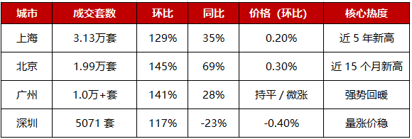 但如果把二手房 + 新房合在一起看,四大一线城市整体成交量同比是大幅增加的,而且出现了北京、上海、广州量价齐升。
