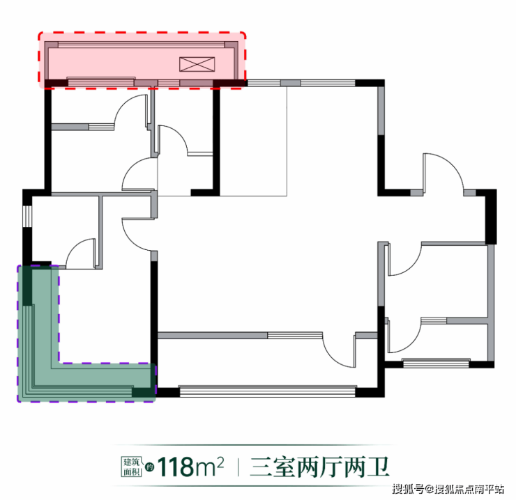 特别值得关注的还有建面约118㎡三叶草户型,使用率约为86%,其三室可改四室的设计,精准匹配了家庭成长周期需求,双明卫+三面采光的布局彻底消灭暗间,提升健康居住体验;L型主卧飘窗则巧妙地将外部生态景观引入私密空间,成为点睛之笔。