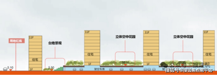 “航母”甲板下排布下沉式庭院会所、阳光地库、艺术车马厅、地下楼宇门厅和业主收纳万宝库,社区设备用房全挪地下室。“航母”甲板上,是全架空的泛会所大花园,回家就是大公园。社区外,西侧绿地退让20米、南侧退让30米做口袋运动休闲公园和花街,生活配套提前考虑到位。