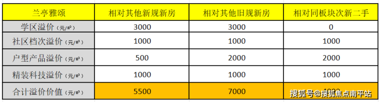 把以上学区、社区、产品、精装和科技实际价值抽出来,兰亭雅颂对比其他项目的真实溢价应该是这样的: