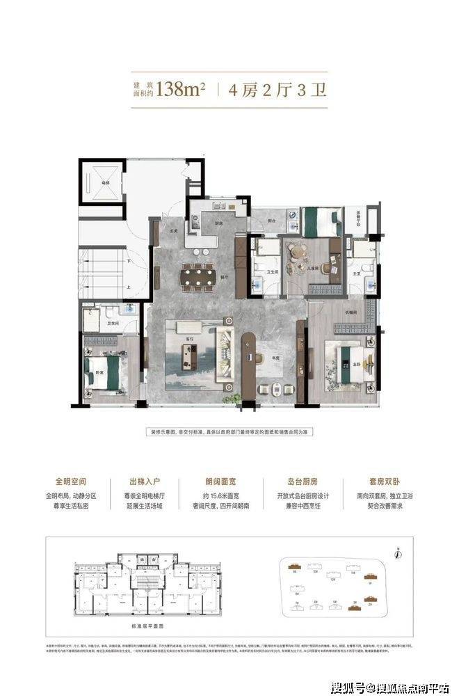 【全明空间】全明布局,动静分区,尊享生活私密【出梯入户】尊崇全明电梯厅,延展生活场域【朗阔面宽】约 15.6米面宽,奢阔尺度,四开间朝南【岛台厨房】开放式岛台厨房设计,兼容中西烹饪【套房双卧】南向双套房,独立卫浴,契合改善需求