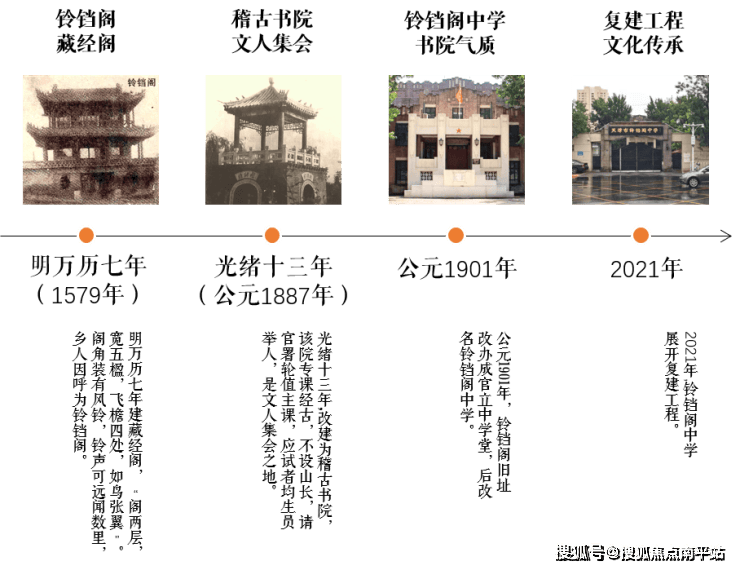 历史上的“铃铛阁”屡经变迁,据《沽水旧闻》记载,初建时期的铃铛阁不仅有保存经书的作用,还是人们精神信仰的寄托之所。清康熙年间,将原“藏经阁”的旧屋拆除,建成之后的稽古书院,和当时天津的其它建筑相比,可谓“壮丽堂皇”。书院周边,盖起平房数间,用作“考文之需”,“凡士子之未仕者,均须报名。官方出题,士子入院作文,高中者奖以金,寒士赖之举火者颇不乏人。”