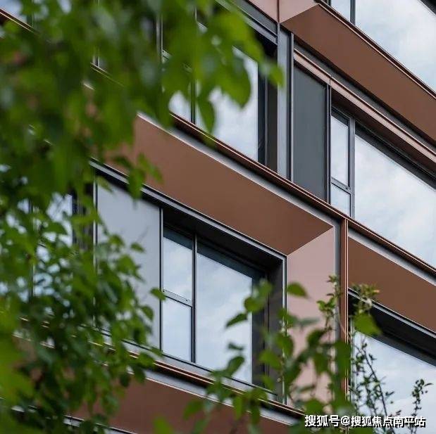 建筑色彩的选择上,提取传统建筑色彩,打造沉着内敛,经得起时间沉淀的立面肌理。仿铜铝板+浅灰色铝线条、仿铜色线条为立面增加一丝温度,营造温馨、浪漫的生活氛围。