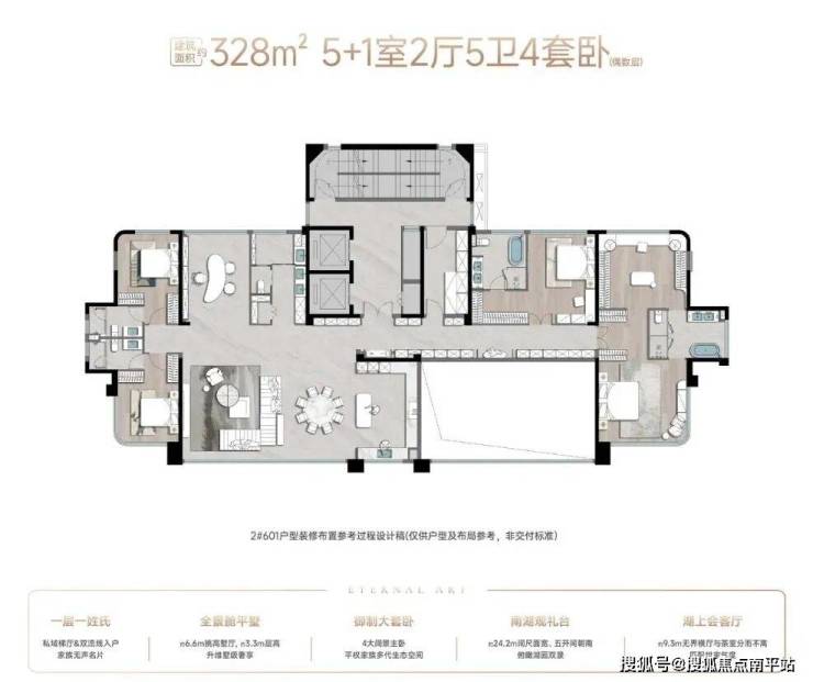 328㎡创造出了罕见的5+1房格局,一层一户,4大阔景主卧,让莆田大平层终于迎来了“大跃进”式迭代。