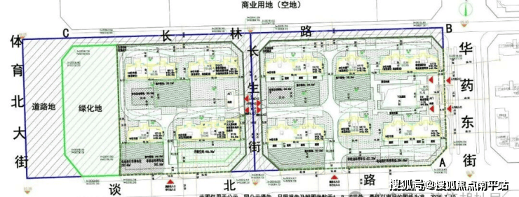 用地东侧是华药东街,道路设计宽度40米,西侧能通过南边两侧的规划路直接联通到体育大街上。北侧长林路、中间长生路道路宽度都是15米,南侧谈北路宽度25米。对于这种规模的小区,交通是十分便利的,但是也带来个问题就是所有住宅都是临路的,没有一栋楼能避免,地块太小了没办法,跟南边地块一个毛病。不过这里也算这一大片地的内部道路了,到时候情况应该还好。另外地块北边是商业用地,未来不知道如何规划,什么业态。要是真商业的话,北侧道路不知道是否有干扰。(要是商墅那就完美了,不过应该不是,当时这块住宅跟商业是打算一块出让的,没人想要商业地,最后只好分开了)