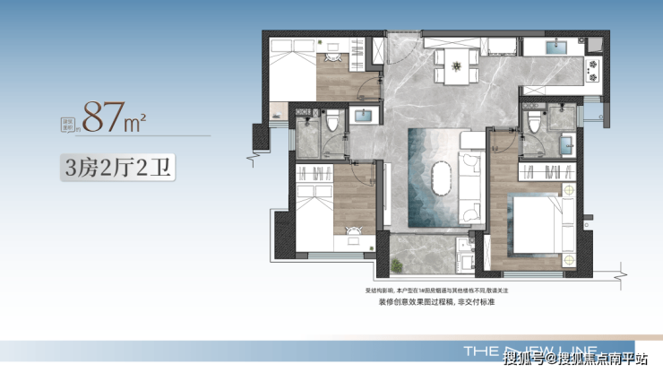 享受级大三房,整个户型结构紧凑,无浪费空间,使用率约93.5%。这个户型,不能只看户型图,在装修体验馆里才能感觉到它那6米宽巨型方厅,270度环幕观景/采光所带来的震撼感。光看餐厨空间,会有一种进入150+户型的错觉,而三个卧室南向并排,空间尺度都很舒展(8#),主卧双面看湖无遮挡,预计实景效果惊艳。这是一个能够享受生活的户型,对于很多小家庭来说,三房够了,不差钱的话可以入手。