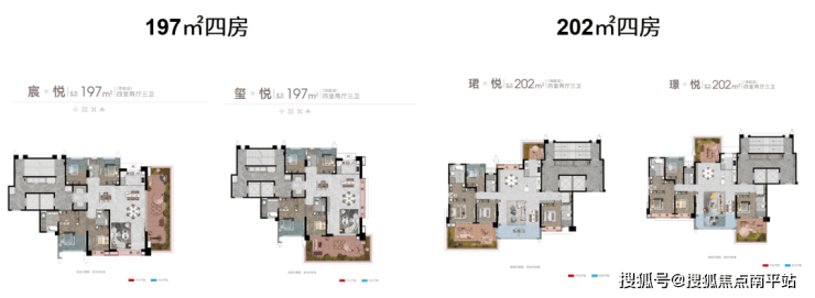 163㎡、197㎡、202㎡创新四代宅,户户配备6米挑高露台,部分户型享南北双露台设计,以“露台+客厅”、“露台+卧室”的多元化空间布局,全面提升居住的开阔性与通透性。