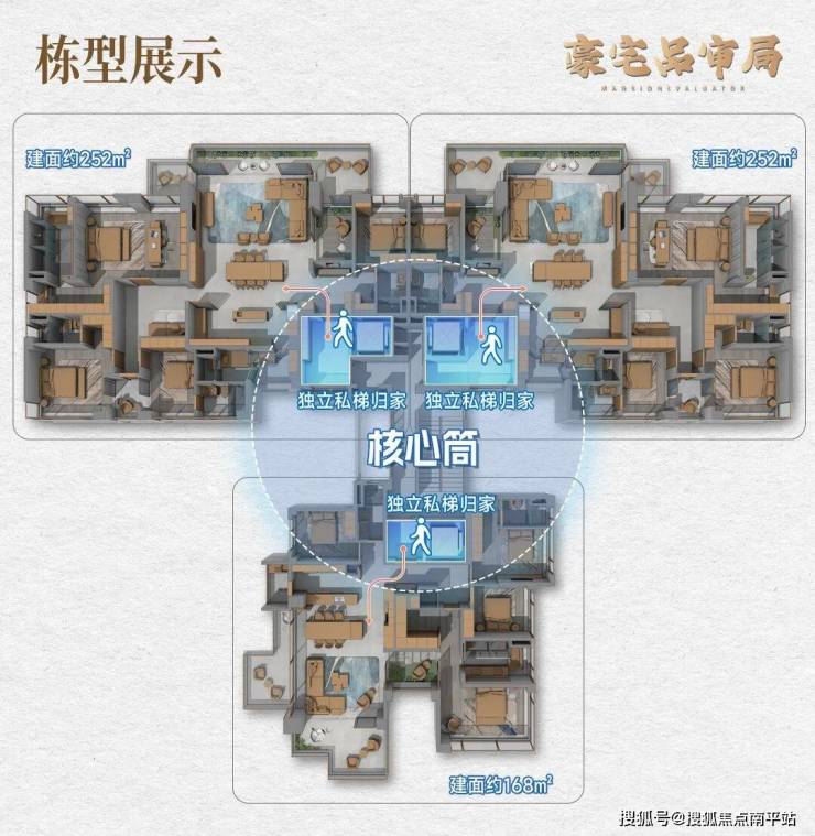 比如,3栋T3的楼王栋型,他们研究了一个核心筒满足每一户都有独立私梯归家的 专属电梯厅。