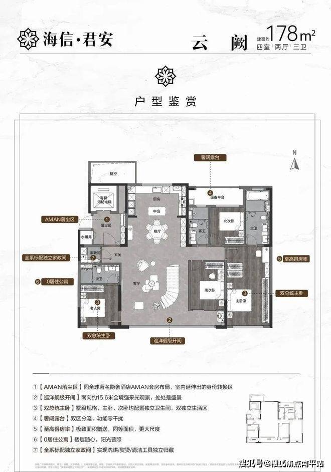 178/228平四室两厅三卫亮点:四面宽,大宽厅,入户子母门,双主卧套房,228平为三个全明卫生间。