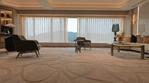 环视室内, 超50㎡的LDKB一体化的大方厅,可以媲美市场上200㎡大平层尺度, 约21.9米的全屋观景面,从客餐厅延伸至卧室乃至更多场景,形成连贯、延绵的无界视野。目之所及,昂贵的园、城、山环幕叠景皆是你家窗口的日常,何等惬意。