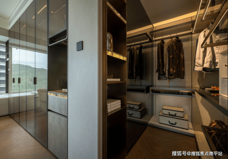 在主卧,除了配置步入式衣帽间,额外预留了一个嵌入式整排衣柜的收纳空间外,而且细分出更多功能区, 让整个空间的动线与空间变得更有情趣。比方我们看到空间内放置了小冰箱,打造一个迷你水吧台,男女主人恰恰小酒,看着窗外城市美景, 定制专属于星级奢华酒店的松弛感氛围。
