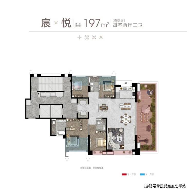 建面约197㎡四房两厅三卫(奇数层)