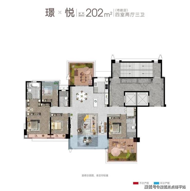建面约202㎡四房两厅三卫(奇数层)