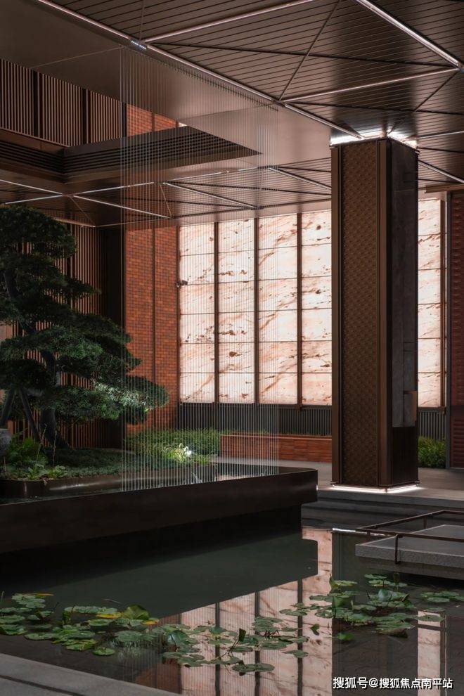 灵感源于闽南古厝中的“天井”设计,这一设计理念将传统与现代完美融合,展现出独特的文化魅力。在建筑内部,屋顶内侧的坡面巧妙地引导雨水从四面八方流入中庭的锦鲤池中。这一设计不仅象征着水聚天心,更体现了天人合一的理学思想。锦鲤池旁,水帘如画,清泉涓涓而下,流入天井中的溪流。溪流两旁,绿植繁茂,山水相融,形成了一幅生动而富有层次的画面。整个空间仿佛自成一派,充满了禅意与静谧,古朴典雅的气息扑面而来。这一设计在保持传统建筑风格的同时,注重对当地文化的表达与传承。精心构建的空间氛围不仅满足了现代人的审美需求,还具有较强的在地性文化感染力。当人们置身其中,便能感受到浓厚的闽南文化底蕴,体验到一种独特的艺术美感。