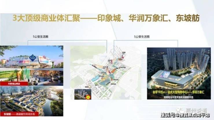 商业:商务新中心——金山滨湖1号,当前惠州规划的第一高楼;东坡舫——高端滨水休闲商业,含多种文化、艺术空间;华润万象汇(建设中)、惠州印象城(山姆会员店)等大型购物超市。