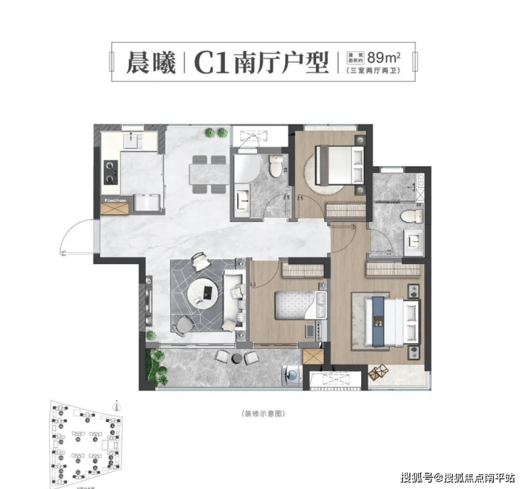 - 【晨曦3房89㎡南厅】 三房两厅两卫