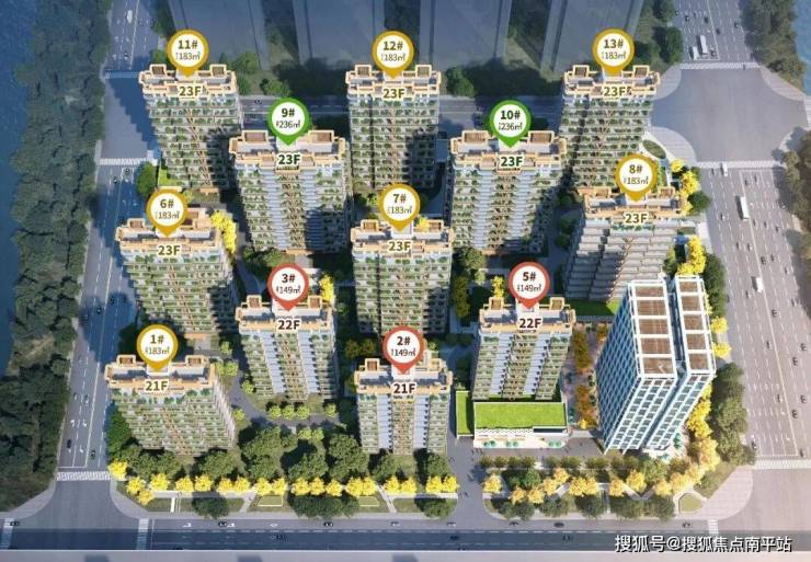 项目规划:总规划516户;小区由12幢高层住宅(21-23F)、1幢甲级写字楼(20F)