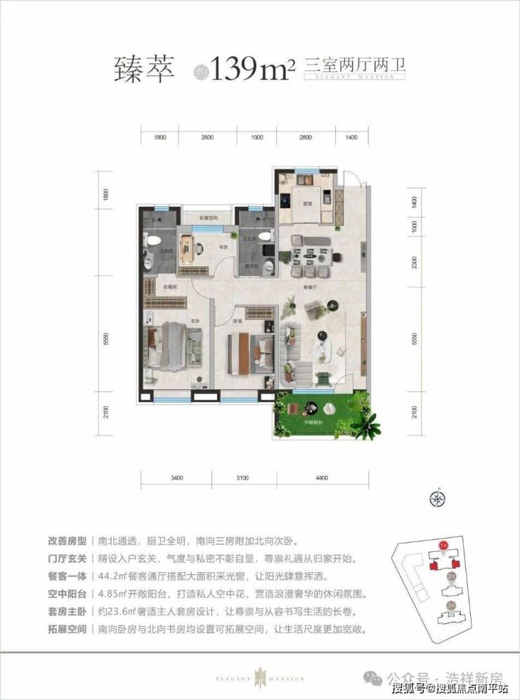 ➢规划:三室朝南丨3.1M质感层高丨赠送可封闭阳台+可拓展空间