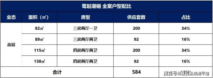 项目产品涵盖面积段为约82-138㎡的3房至4房,合计584户。其中主力产品82平小三房及115平小四房,项目产品以刚需、刚改为主,辅以少量改善型产品138平四房。