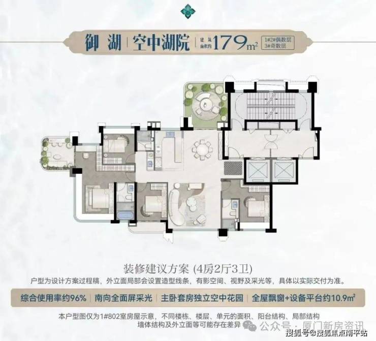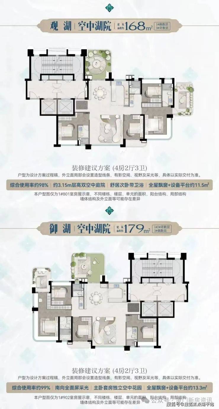 空中湖院179㎡五房三卫(楼王户型)综合使用率约100%,约18㎡空中私享庭院,约3.15m极致层高。