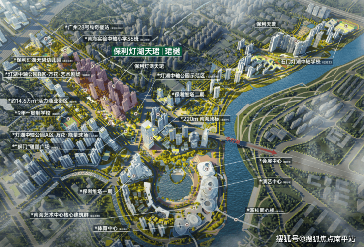 目前周边已有多个项目取得进展:南海艺术中心(含大剧院、博物馆等)已动工,千灯湖演艺中心完成签约,沥桂人行天桥完成招标,千灯湖音乐秀场已举办多场活动。