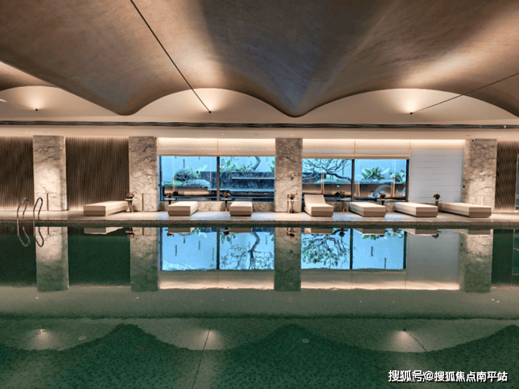 泳池部分, 以弧形GRG天花打造光穹效果 ,同时在顶面做了 金色肌理艺术漆 ,池壁采用 图纹水晶马赛 克 ,赋予空间满满的艺术气息;就连更衣室也是高定打造,洗手台采用 绿野仙踪奢石 , 融入非遗技艺的艺术画作 点缀,细节处彰显奢华。