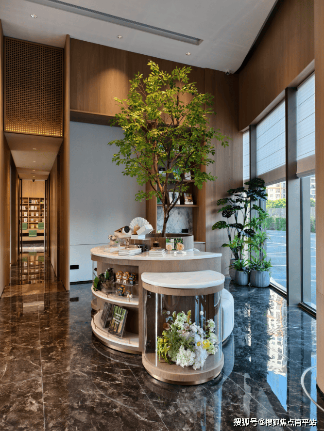 而 樾心书吧 部分,则 更凸显空间的通透明亮感,通过 柔和的暖色调 奠定松弛舒适的基调, 大面积落地窗 引入自然光线的同时,让空间更显通透开阔,细节处的 绿植、艺术摆件 点缀其中,呈现出兼具文化气质与舒适体验的书享会客厅氛围。