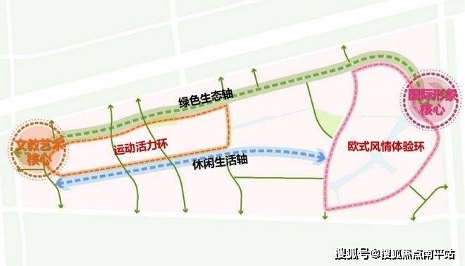 国际形象中心由音乐喷泉广场、星河湾、360度全景生活体验馆等组成;文教艺术核心由幼儿园、小学、网红图书馆等组成;绿色生态轴即国际大道,串联公园城内2大核心和多个学校;生活休闲轴即公园大道,串联东西社区。两大道分别种植法国梧桐和白蜡树,因此形成不同的景观生态轴。欧式风情体验环以英式庄园76号为核心,运动活力环能够串联起体育公园、国际社区中心等场所,旨在打造全龄化运动休闲体验区。