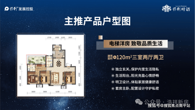 保利叶语匠心打造建面约110-151㎡瞰景高层/电梯洋房,格局方正,采光俱佳。119㎡全明三室,14%低公摊,高空间利用率,动静分离,三室朝南,主卧步入式衣橱,独立卫浴,享受优雅生活;120㎡奢阔三室,独立入户,门口舒适空间私享,户内南北通透,四室朝南,尽享阳光宠爱,干湿分离双卫生间,开启居家健康。