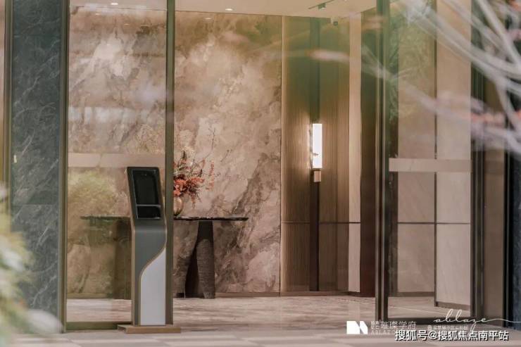 1.出入归家礼待:东入口社区大堂面积约120㎡,层高约5.5米(装修后约4.7米),墙面为瓷砖通铺,地面为石材微缝拼接,右侧通过大面岩板+天然云石壁灯渲染酒店式归家氛围;楼栋入户大堂采取电动对开门设计,层高约3.6米(装修后约3.1米),悬浮吊顶,墙面及地面通铺“简一(900*1800)”瓷砖,充分运用光影变化、艺术点缀、高贵建材等手法强化了精致的空间美学,匠著更契合业主的学府生活方式