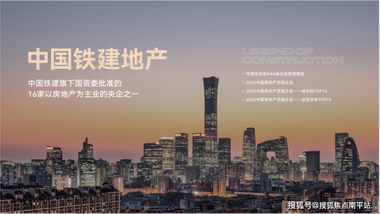 中国铁建地产 千亿房企 做中国最具价值的美好生活服务商☆国资委批准的16家以房地产为主营业务的央企之一☆2019年迈入千亿房企阵营☆2023年中国房企销售业绩TOP15☆2023年中国房企新增货值TOP8☆中房协评定AAA级企业信用最高等级