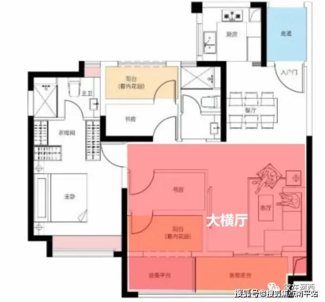 这意味着横厅的面积可以高达约40㎡,对于98㎡户型来说是相当哇塞。