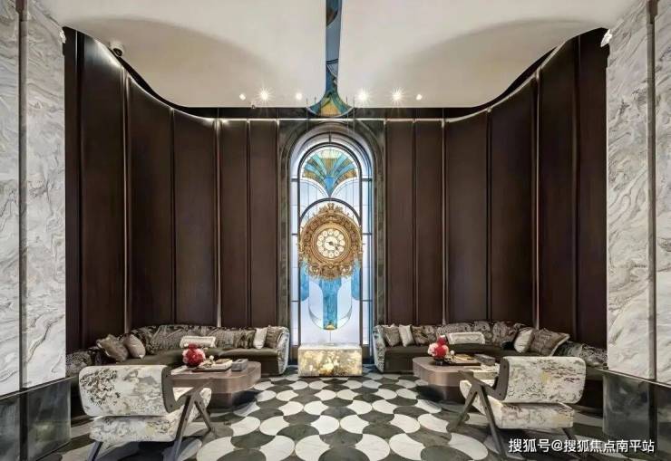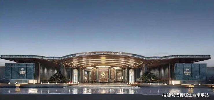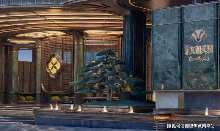 约76.7米宽、8.8米高的宏伟尺度,位列岛外最大门庭之一。 以海派南洋风为基调,复刻鼓浪屿八卦楼的中轴对称形制,尽显经典格局。双圆悬挑云母石鎏金穹顶,灵感源自容谷别墅与客家土楼,寓意圆满和谐;奢石景墙、迎客松与闽南花砖铺地,构筑层次丰富的空间意境; 悬浮金属格栅融入非遗珠绣工艺,点缀海棠纹与扇形纹样,彰显细腻工艺与东方美学。