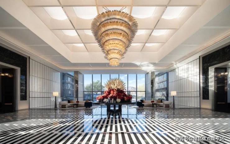 凤栖和鸣以全球顶奢美学重塑塔尖生活范式。 约15米挑高的翡丽大堂,通过全面屏巨幅玻璃将星光水院、莲花山色引入空间,构筑山色入窗满,溪声绕座流的意境。