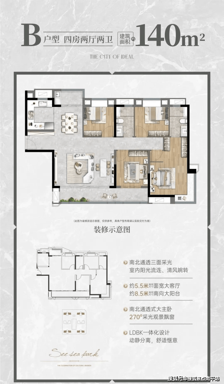 该户型做到南北通透、三面采光,整体居住品质跃级提升。约5.5米面宽大客厅+约8.5米南向大阳台+餐厨一体设计,营造阔绰空间感;主卧更以L形270°观景窗点睛,广角视野将体验感和价值感再次拉升;给到远超同面积段的生活获得感。