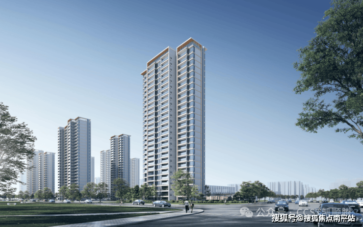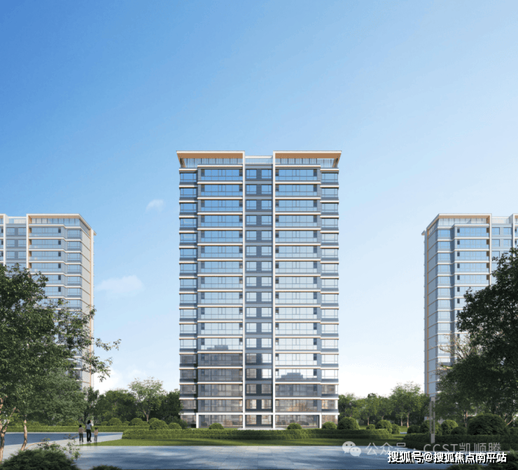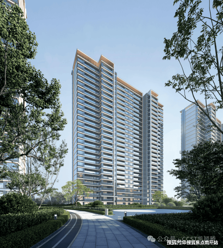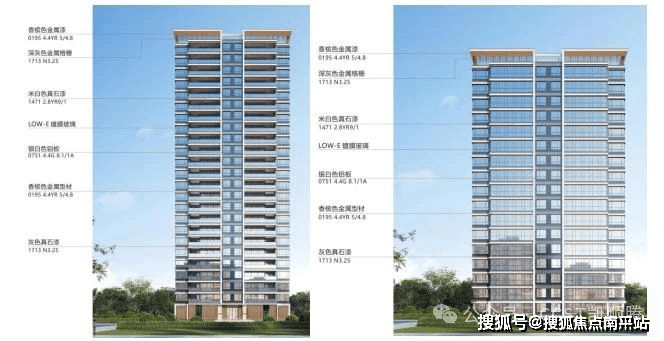 三段式的立面划分和现代简约精工风格,更显稳重大气。顶部银白色折板与金属格栅结合,形成虚实结合,精致轻盈的顶部符号。中部以米白线脚+香槟金收边,体现结构细节美感。底部以精致的入户门头为核心,采用米白色石材+香槟金铝板,营造亲切的高级感。