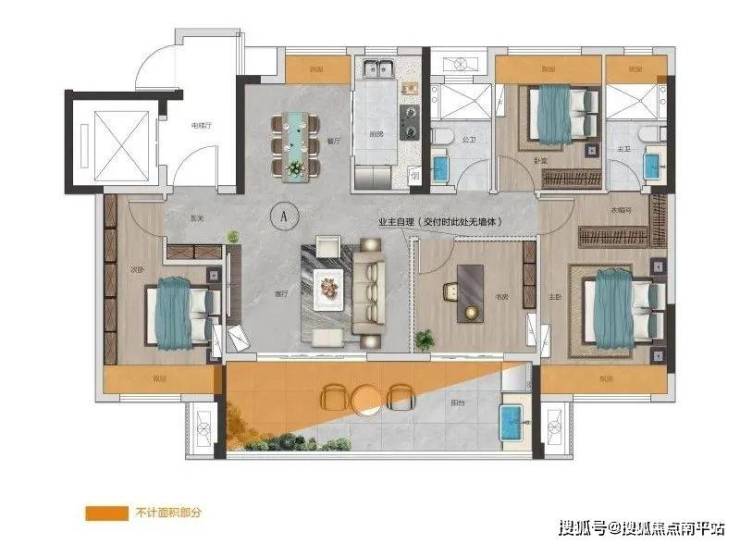 整个户型的设计很主流, 约14米的四开间朝南,约7.7米的大横厅,阳台面积达到约18个平,飘窗处处全尺寸,还有独立电梯厅......空间尺度能展开的几乎全展开了。