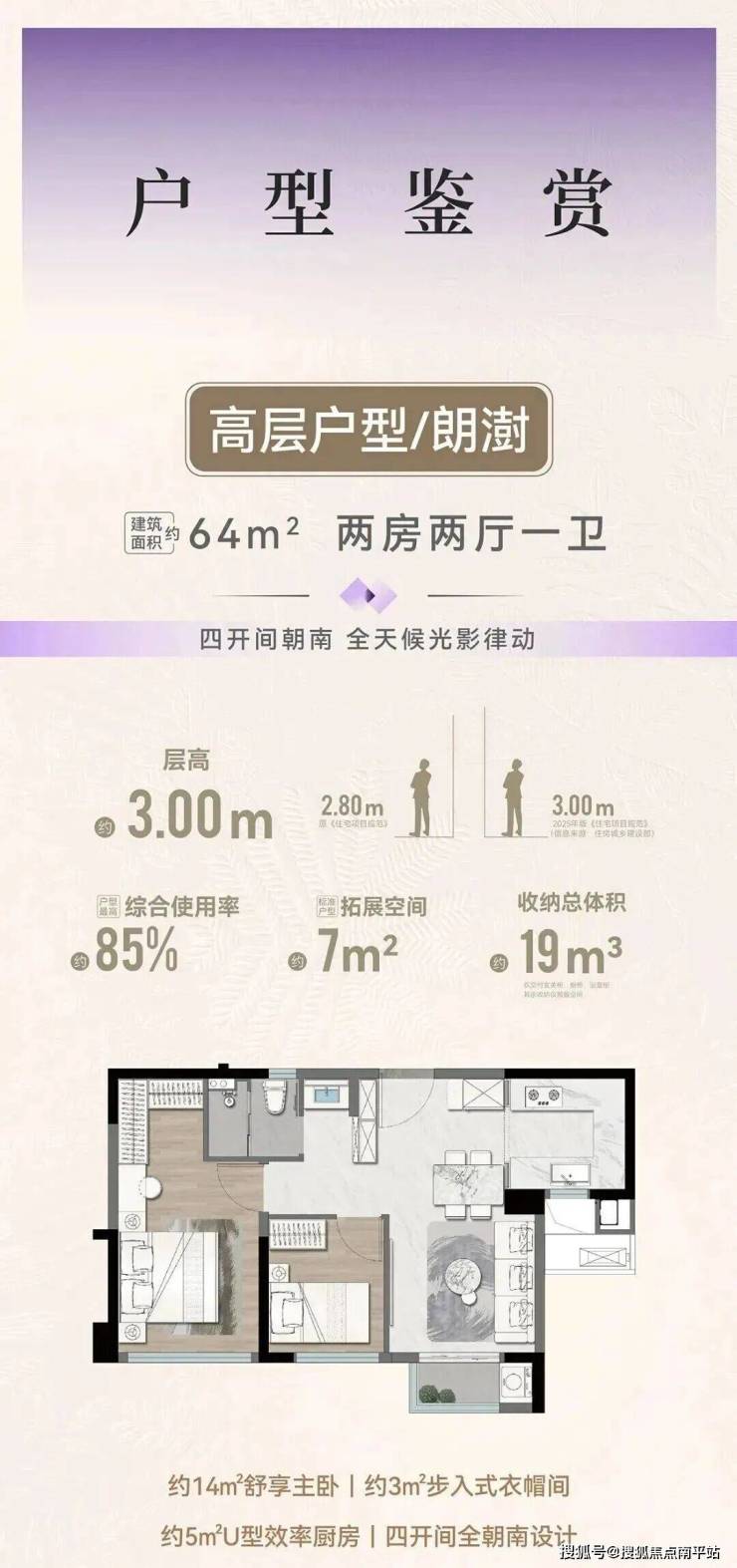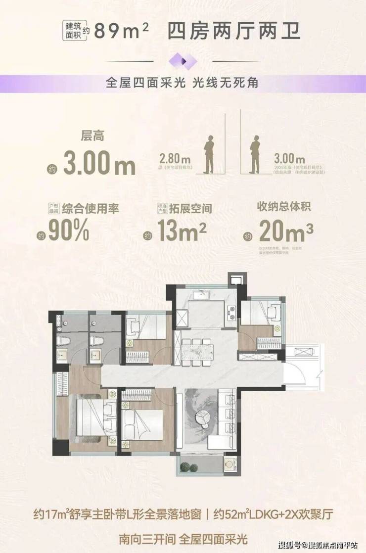 项目规划4栋高层2梯5户,64平2房、75平3房、79平3房、89平四房(得房率85%—90%)层高3米;5栋洋房1梯2户,95平四房、112平四房(得房率97%—98%)层高3.1米。户户均有外阳台
