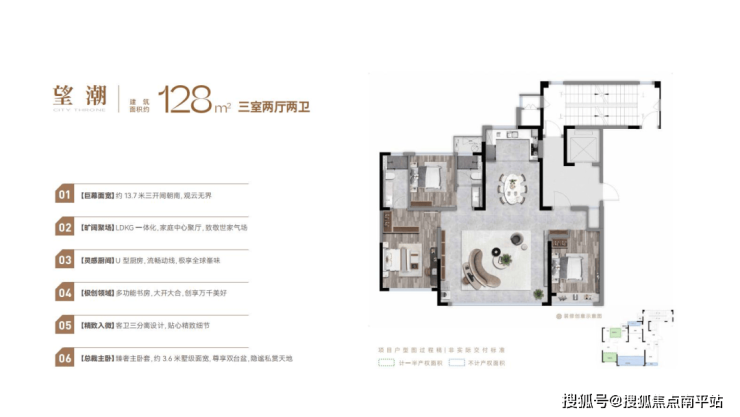 建面约128㎡三室两厅两卫户型,2梯2户设计,双玄关设计,归家仪式拉满;面宽约13.7米,三开间朝南,拥揽巨幕峯光;U型厨房,流畅动线,主卧套房约3.6米面宽,主卫双台盆,隐谧私享。