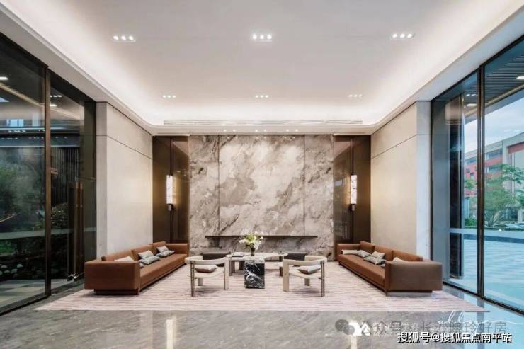 1.出入归家礼待:东入口社区大堂面积约120㎡,层高约5.5米(装修后约4.7米),墙面为瓷砖通铺,地面为石材微缝拼接,右侧通过大面岩板+天然云石壁灯渲染酒店式归家氛围;楼栋入户大堂采取电动对开门设计,层高约3.6米(装修后约3.1米),悬浮吊顶,墙面及地面通铺“简一(900*1800)”瓷砖,充分运用光影变化、艺术点缀、高贵建材等手法强化了精致的空间美学,匠著更契合业主的学府生活方式