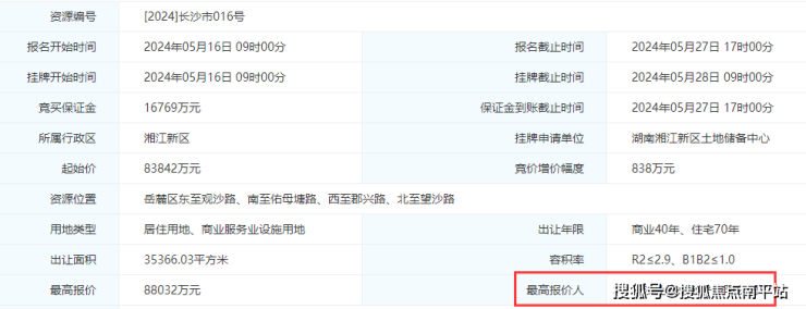 5月,长沙观沙岭正地铁口016地块经过6轮出价,被长沙兆禧房地产有限公司(建发)溢价5%拿下,成交价88032万元,成交楼面价9420元/㎡。