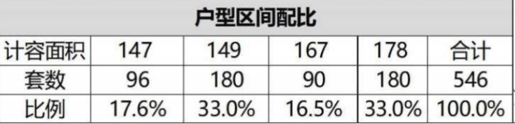 项目共规划有11栋住宅,层高17-32层,从面积段看,主力户型为 147㎡、149㎡、167㎡、178㎡共4个户型,具体户型占比如下: