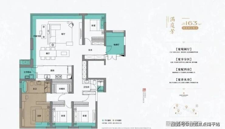 厨房连工作阳台(储物 / 晾晒),独立电梯厅 + 玄关 + 衣帽间强化收纳;主卧配 270° 景观卫浴,多卧室布局兼顾隐私。