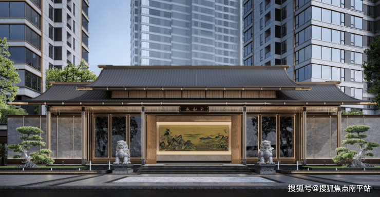 搭配千万级奢石,《清明上河图》漆画镇宅,五级台阶,两侧石狮拱卫,罗汉松迎宾,每一处都彰显着宋式营造,有世家礼序、威仪门庭之势!