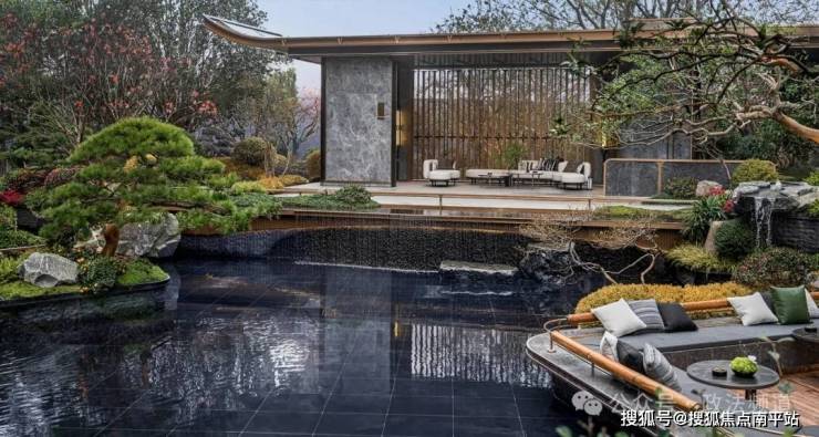 整个园林采用围合式布局,拥有“七大主题组团与四大功能空间”,其中,中庭景观园林约3300㎡,采用对景、借景、框景、障景的造园手法运用,营造出沉浸式的酒店式度假秘境。